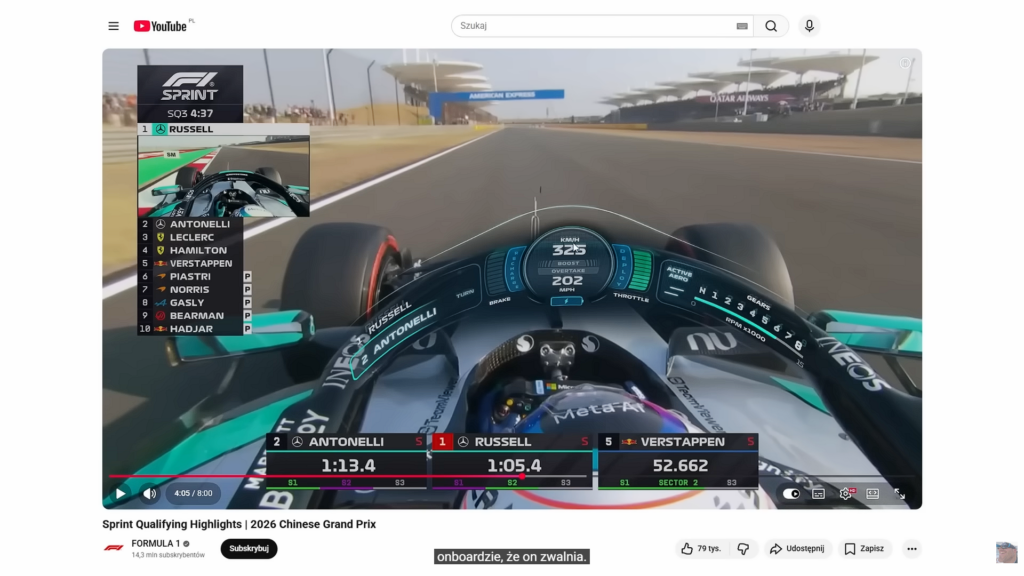 POTĘŻNA WYGRANA WŁOSKIEGO NASTOLATKA W F1! [RECENZJA GP CHIN 2026] (Rajdy Formuły Pierwszej, YouTube, 18.06.2026, https://www.youtube.com/watch?v=tSK5kN8bIKs&t=540s)