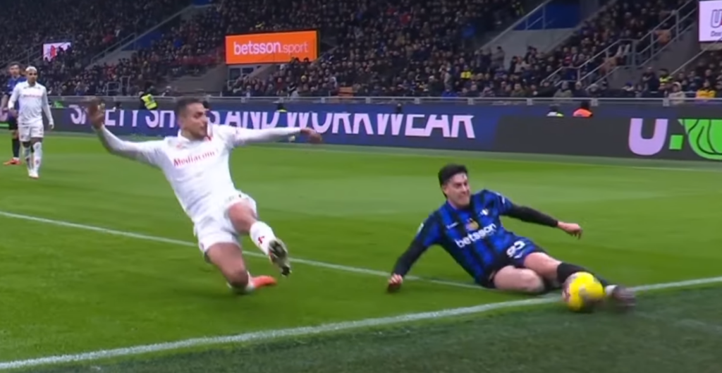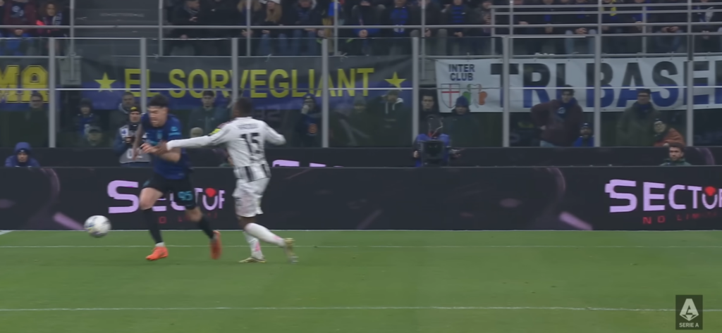 Widzimy tutaj jak Bastoni dośrodkował, jednak piłka była już poza boiskiem. W wyniku dośrodkowania Inter zarobił rzut rożny, z którego później padła bramka na 1–0.